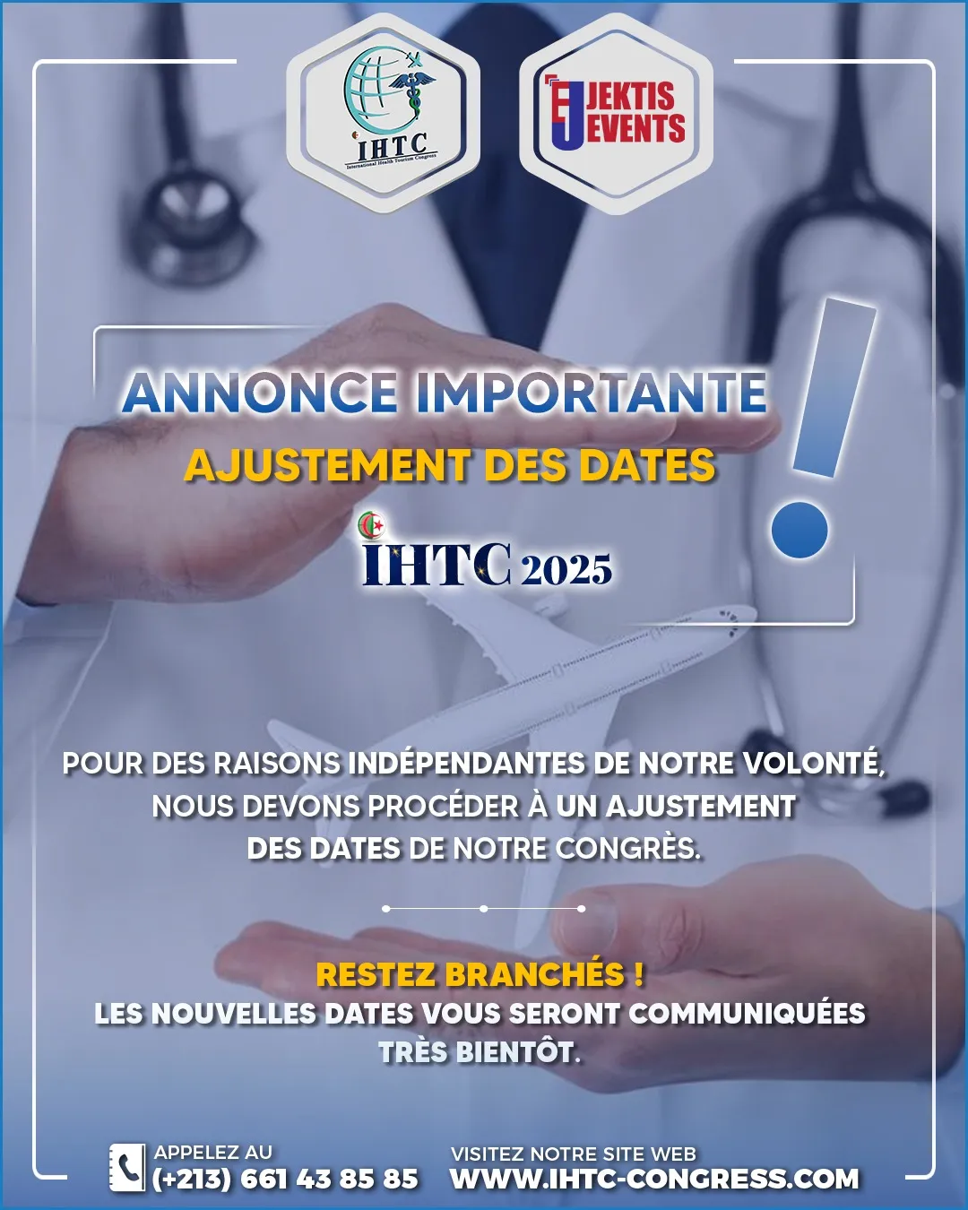 La 2ᵉ Édition du Congrès International de la Santé et du Tourisme Médical « IHTC » se tiendra du 13 au 15 Novembre 2025 à l’hôtel Mercure, Bab Ezzouar sous le haut patronage des ministères de la Santé et du Tourisme.